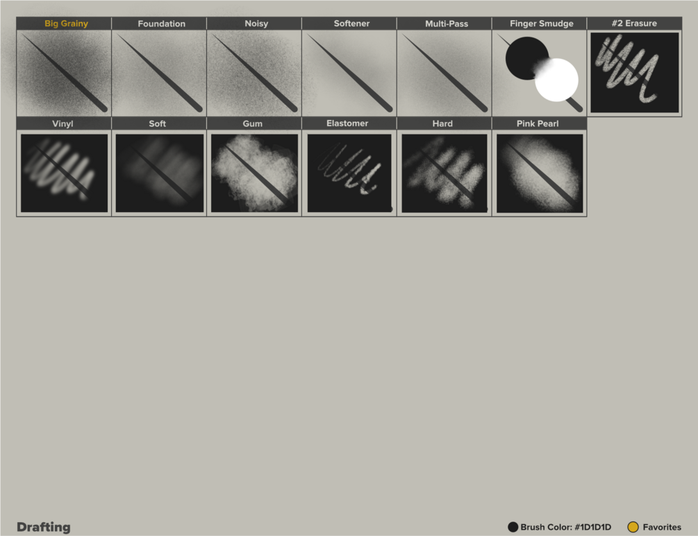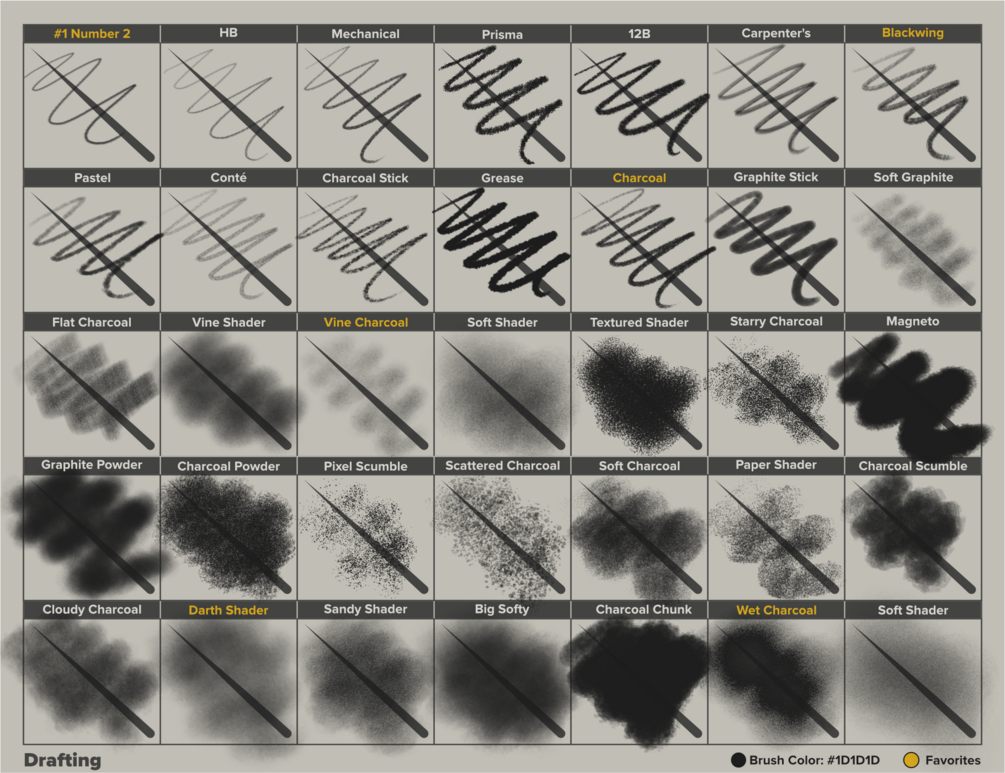 These brushes were designed to simulate pencils, charcoal, and graphite media as well as erasures. Each brush has tuned pressure and tilt sensitivity for pen/tablets. They are great to use for quick sketches, underdrawings, and give your work a traditional aesthetic.